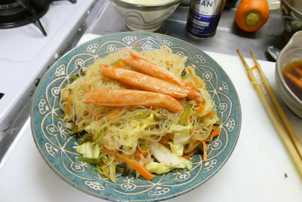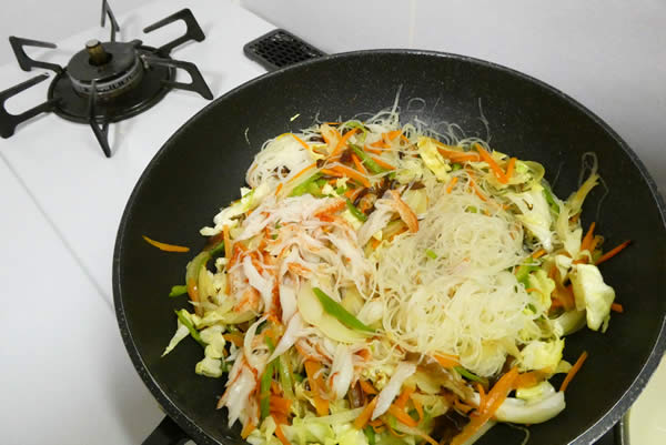 | 4. | 熱したフライパンにごま油をひいて、まず、人参・ピーマンをサッと炒め、次にキャベツ・きくらげ・玉ねぎ・カニかまを加えて混ぜ合わせ、用意してあったビーフンを入れて、軽く塩・胡椒を振る。 |