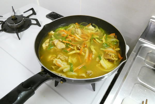 | 3. | そして水をフライパンの3/4くらいの位置まで入れて沸騰させてから、味覇をお湯で溶いて加えて、カレー粉も適度に味見しながら加え、しばらく煮込む。 |