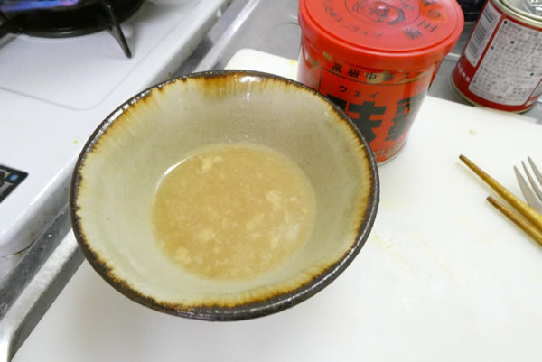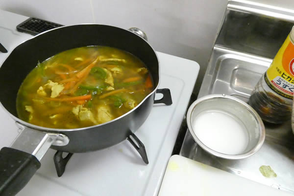 ここで中華味らしくするために、味覇をお湯で溶かして流し込みます。そしてここらが、味見三昧。塩・薄口しょう油、場合によっては、もう一度味覇。味が濃すぎたら水を足す。こんなことの繰り返し。胡椒は使いませんでした。カレー粉があるから、いいじゃないの