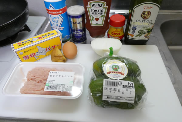 材料はこんな感じ。ピーマンは、ちょっと大き目のがあったので、美味しそう。ケチャップはカゴメではなく、ハインツを使います。別に意味はありません。「逆さまだからすぐに出る!」すぐに出ました。