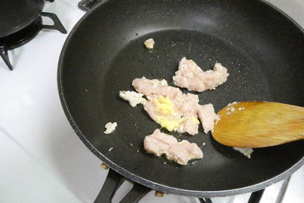 さて、本番スタートです。フライパンにオリーブオイルをひいて、残してあった鶏ひき肉を生姜で炒めます。木べらでほぐしながら、ひく肉が固まらないようにします。