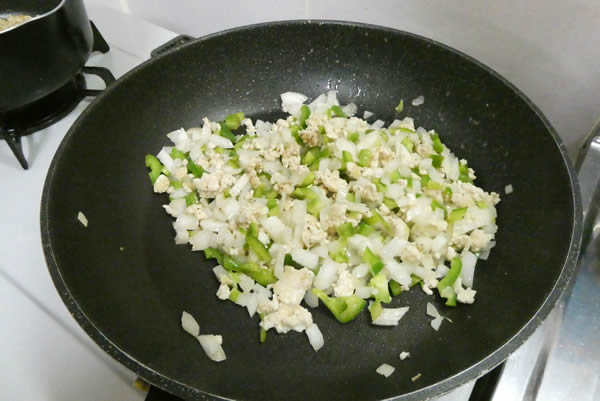 | 4. | フライパンを熱してオリーブオイルをひき、鶏ひき肉を生姜で炒め、パラパラにほぐす。次に、みじん切りしたピーマンと玉ねぎを加えて混ぜ合わせ、軽く塩・胡椒を振りかける。 |