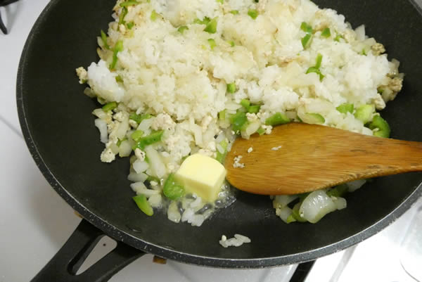 | 6. | バターを溶かし入れて、塩・胡椒・顆粒コンソメで味を整え、トマトのみじん切りを加えて、さらに混ぜ合わせる。 |