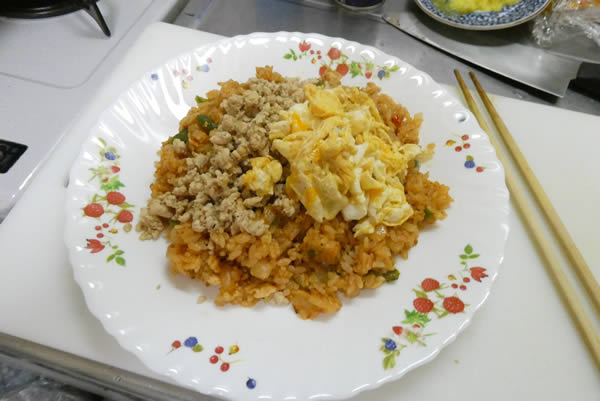 | 8. | お皿に盛り付けて、上にスクランブルエッグと、用意してあった鶏そぼろをかけて出来上がり。 |