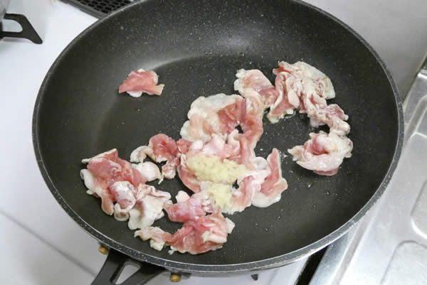| 2. | 鶏がらスープをお湯で溶かし、お酒・みりん・薄口しょう油で炒める時に使用するスープを作る。 |