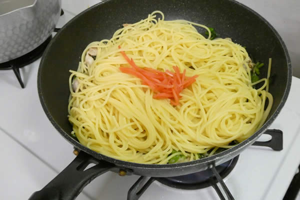 | 5. | 麺が茹で上がったら、湯を切ってフライパンに入れ、紅生姜も加えて、具材を麺にからませながら、茹で汁を足すなどして味を整えて出来上がり。 |